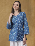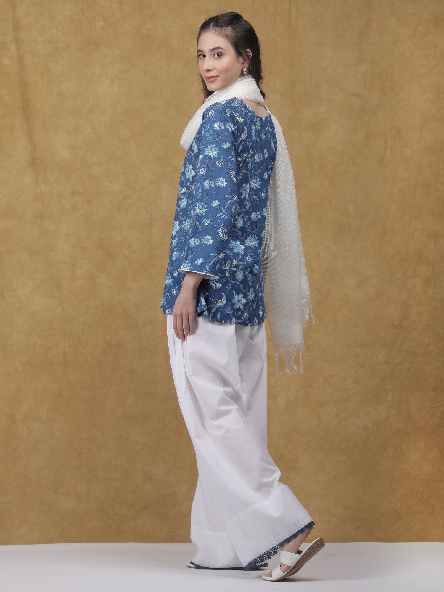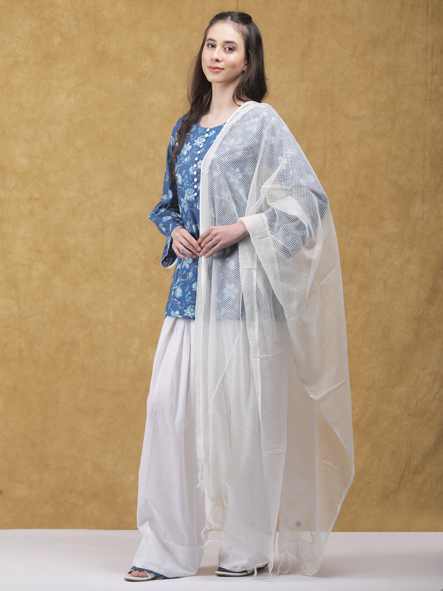 Graceful and timeless, the Chandini Kurta Set with Dupatta is crafted in soft, breathable cotton for an effortlessly elegant look. The printed blue kurta features delicate floral motifs and refined button detailing, paired with relaxed white pants that offer a fluid, comfortable silhouette. A lightweight white dupatta completes the ensemble, adding a touch of softness and charm—perfect for festive mornings, intimate gatherings, or everyday sophistication.
