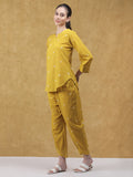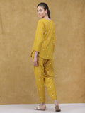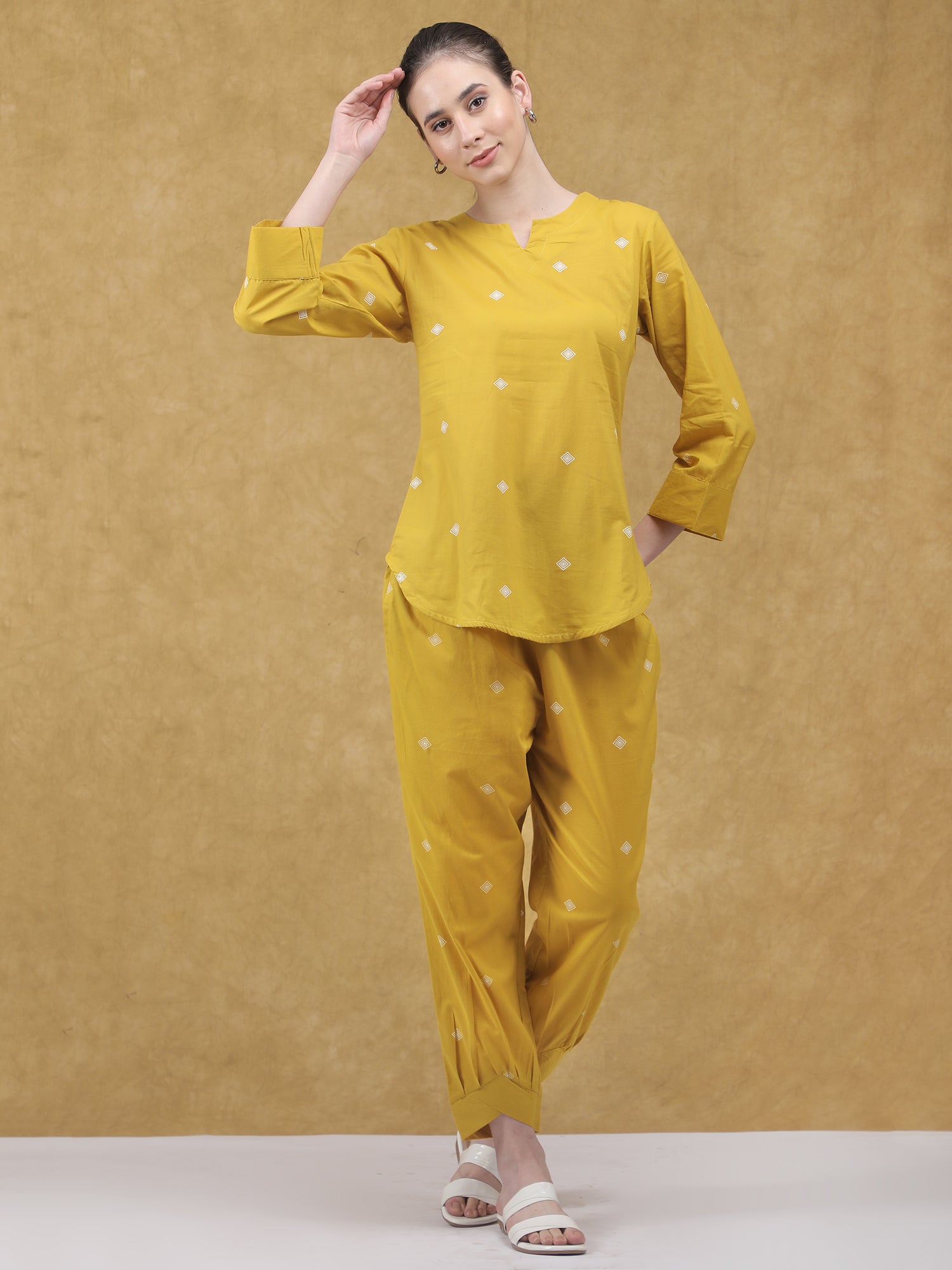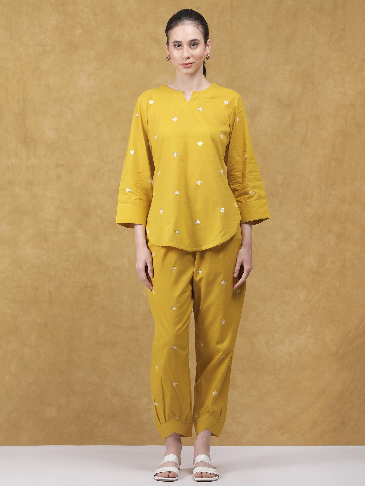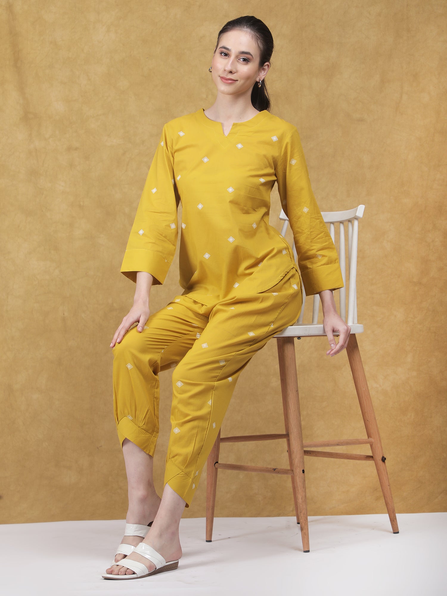 Effortless, warm, and versatile, the Golden Ease Co-ord Set is crafted in soft, breathable cotton for everyday comfort. The mustard-yellow top features subtle embroidered motifs and a clean neckline, paired with matching relaxed-fit pants for a cohesive look. Designed to move with ease, this co-ord set is perfect for casual outings, workdays, or understated festive moments.