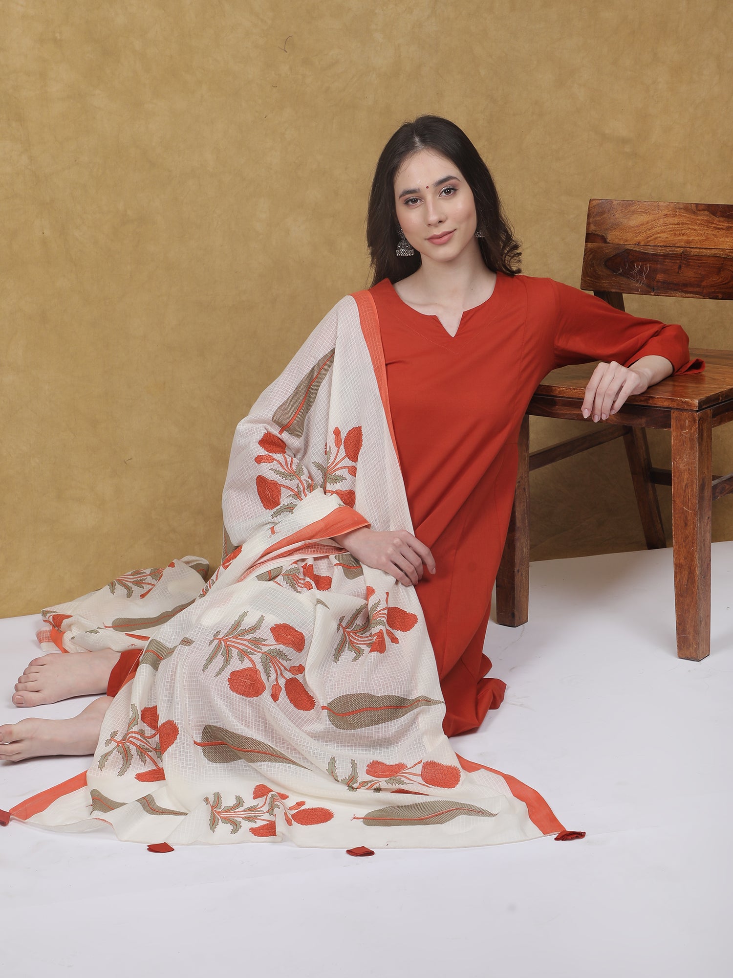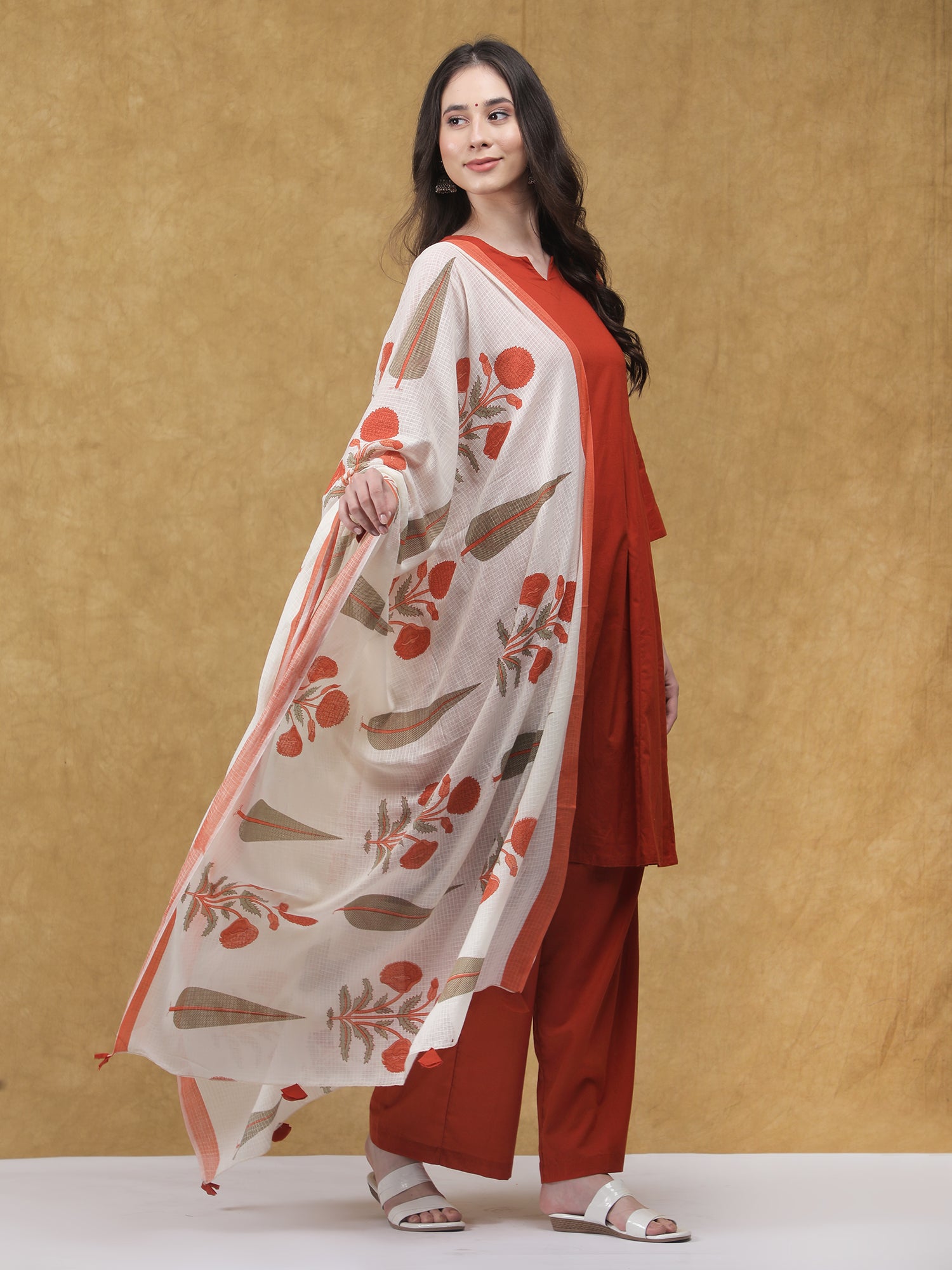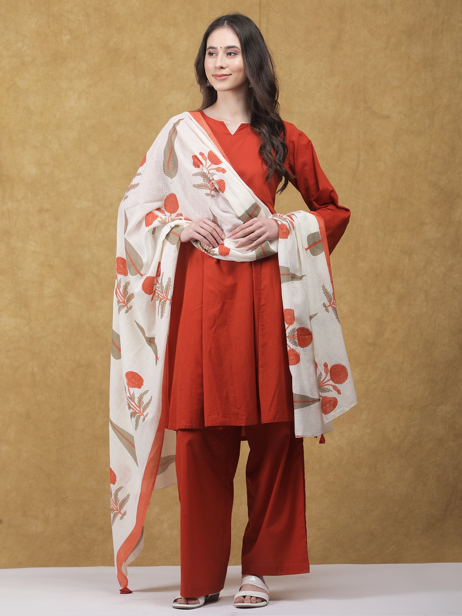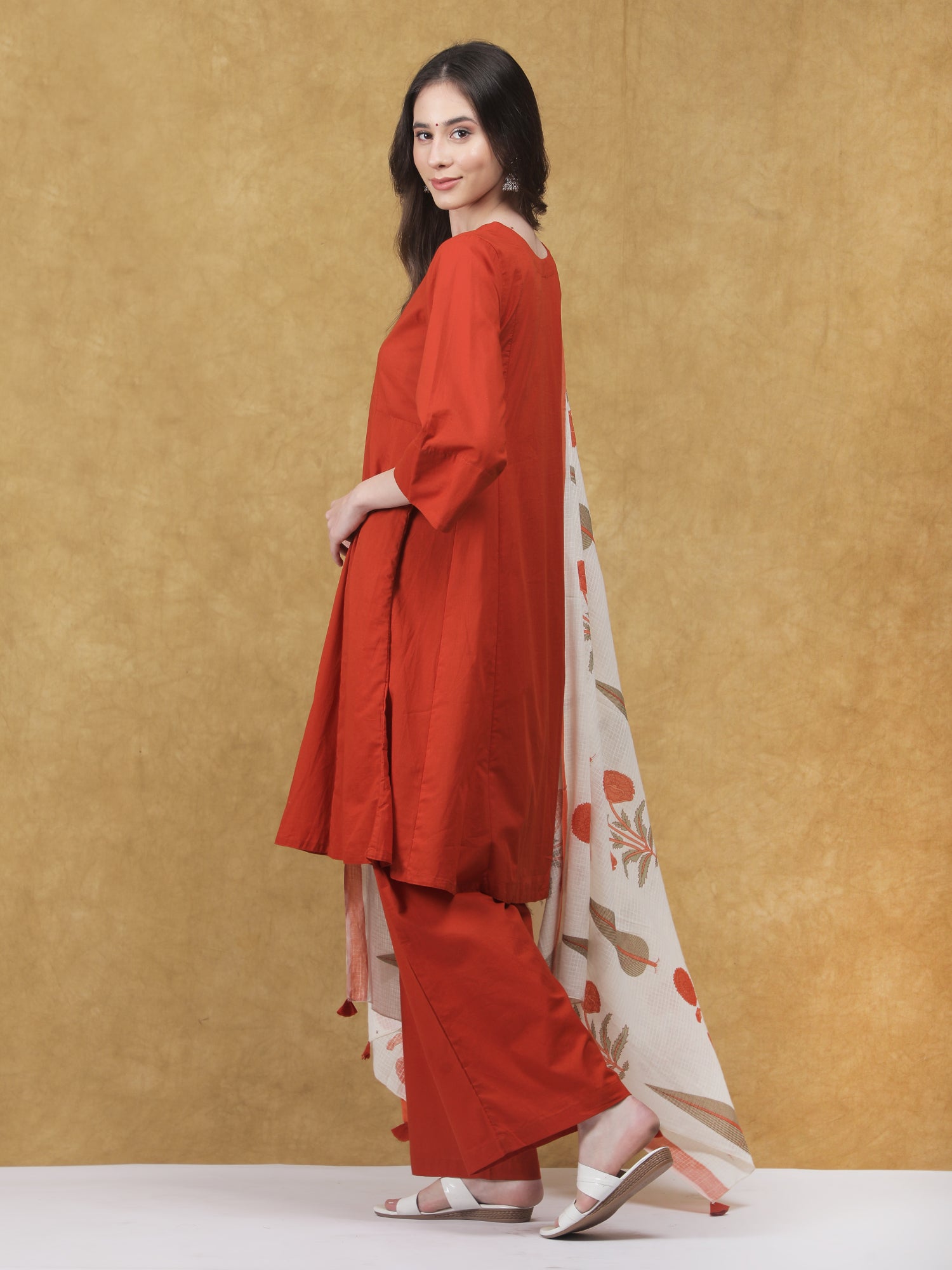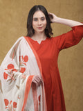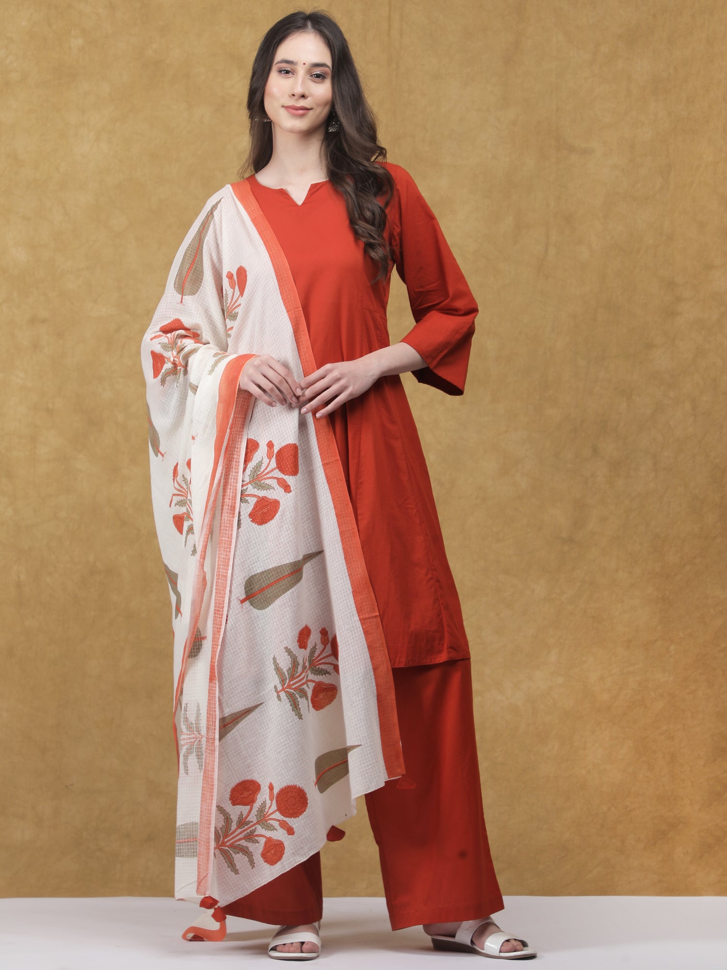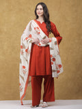 A timeless blend of comfort and tradition, the Kesariya Kurta Set is crafted in soft, breathable cotton for effortless elegance. The solid rust-orange kurta is paired with an off-white dupatta featuring delicate Sanganeri print, adding a touch of artisanal charm. Finished with relaxed-fit cotton pants featuring a functional pocket, this set is perfect for festive mornings and everyday wear.
