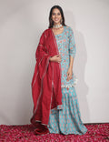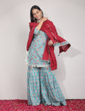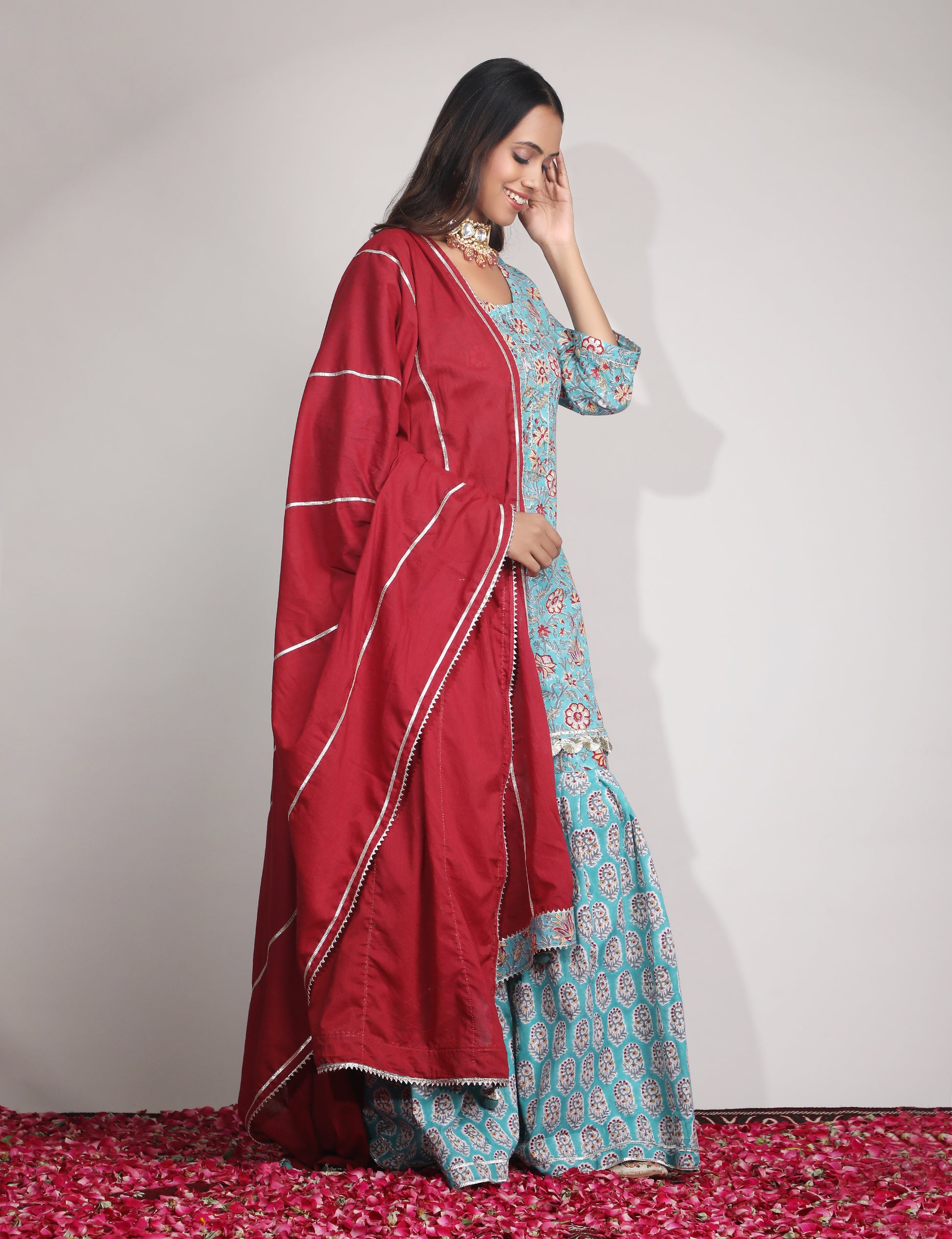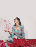 Colour: Aqua Blue with Multicolour Floral Prints & Red Dupatta