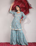 Step into timeless elegance with our Khwaab Sharara Set, a dreamy ensemble that celebrates festive charm and artisanal beauty. The aqua blue kurta is adorned with intricate floral block prints and finished with delicate lace trimmings along the hem, adding a touch of feminine grace.