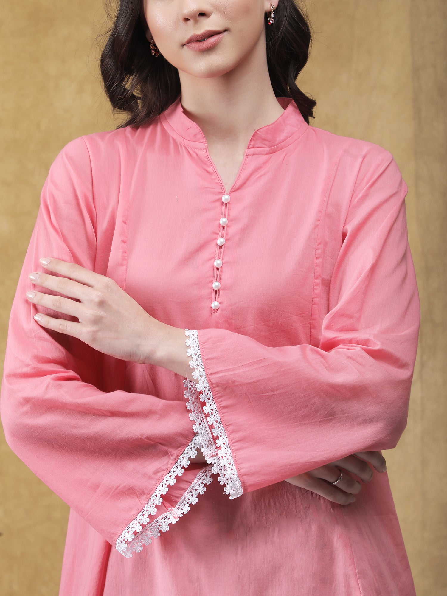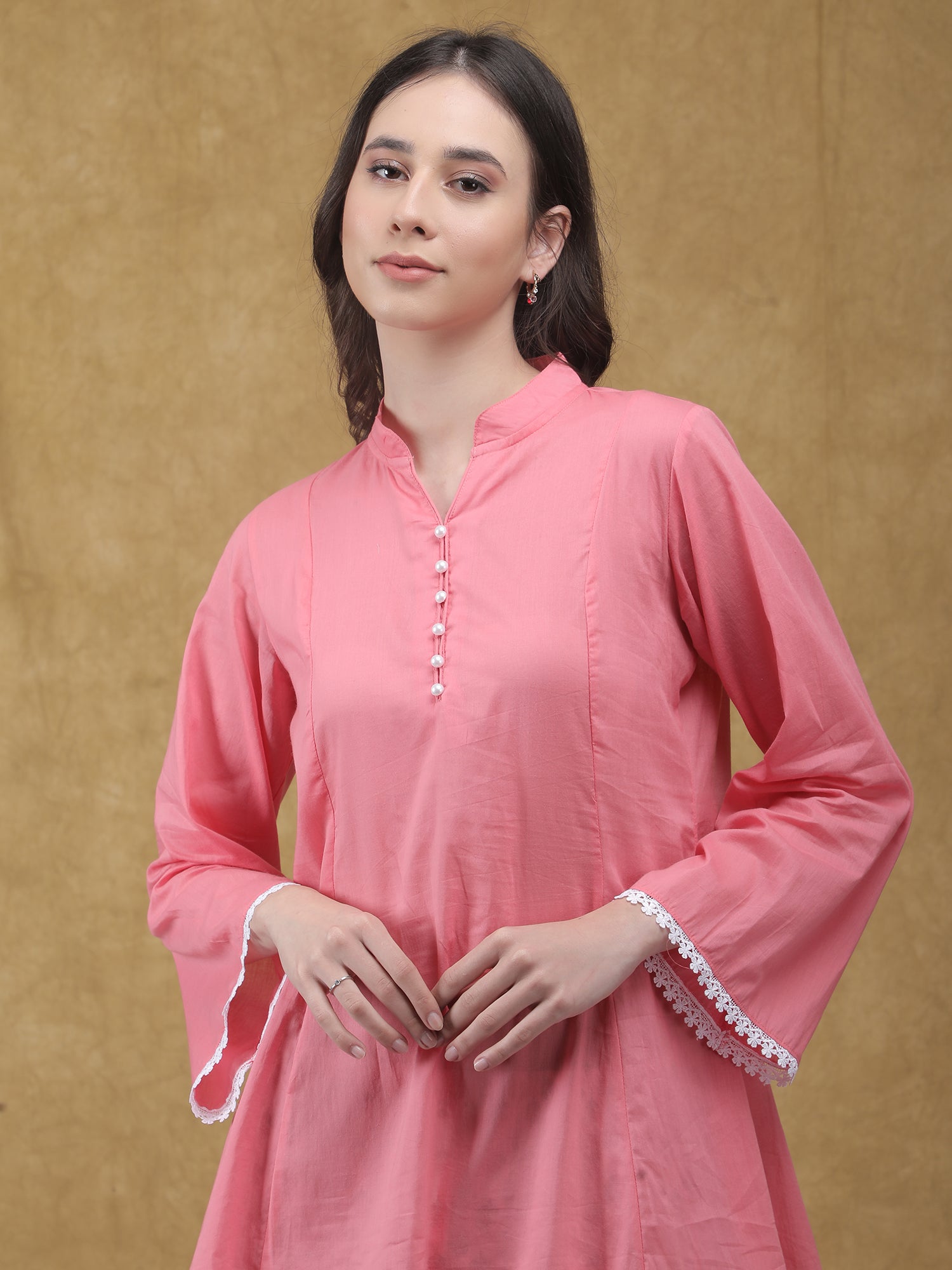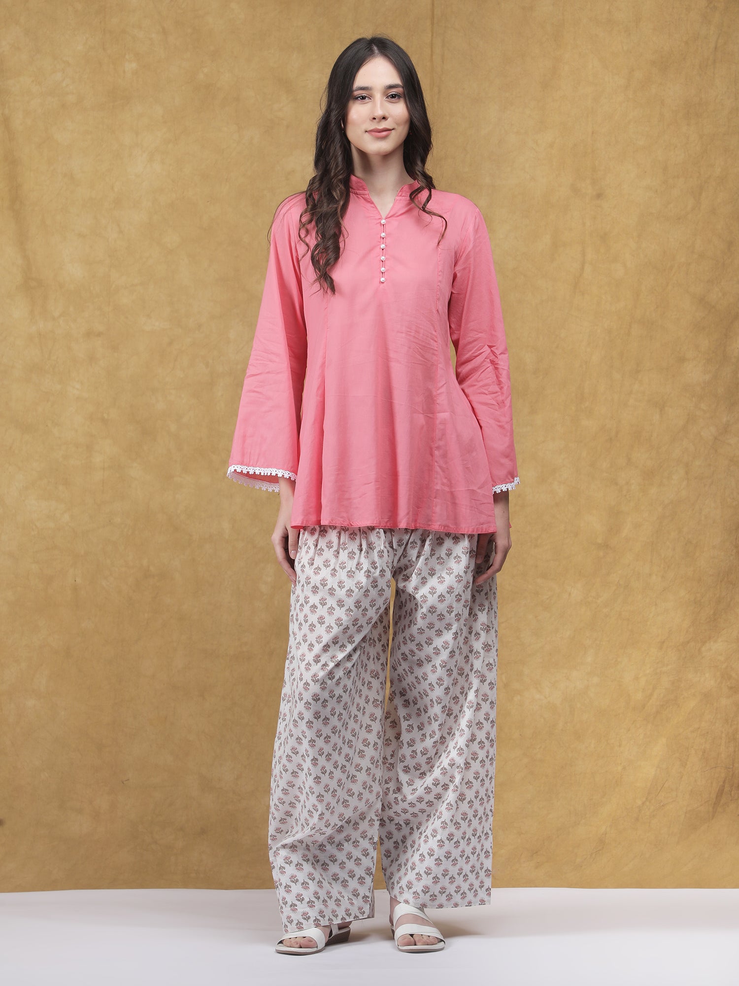 Soft, minimal, and effortlessly elegant, the Komal Kurta with Farshi Salwar is crafted in breathable cotton for all-day comfort. The solid kurta features a gentle silhouette with delicate button detailing and subtle lace accents on the sleeves, paired with a printed farshi salwar that adds a touch of traditional charm. Perfect for relaxed festive days, casual gatherings, or everyday wear.
