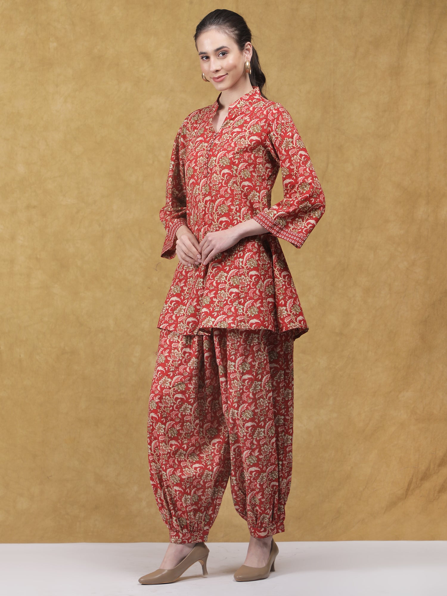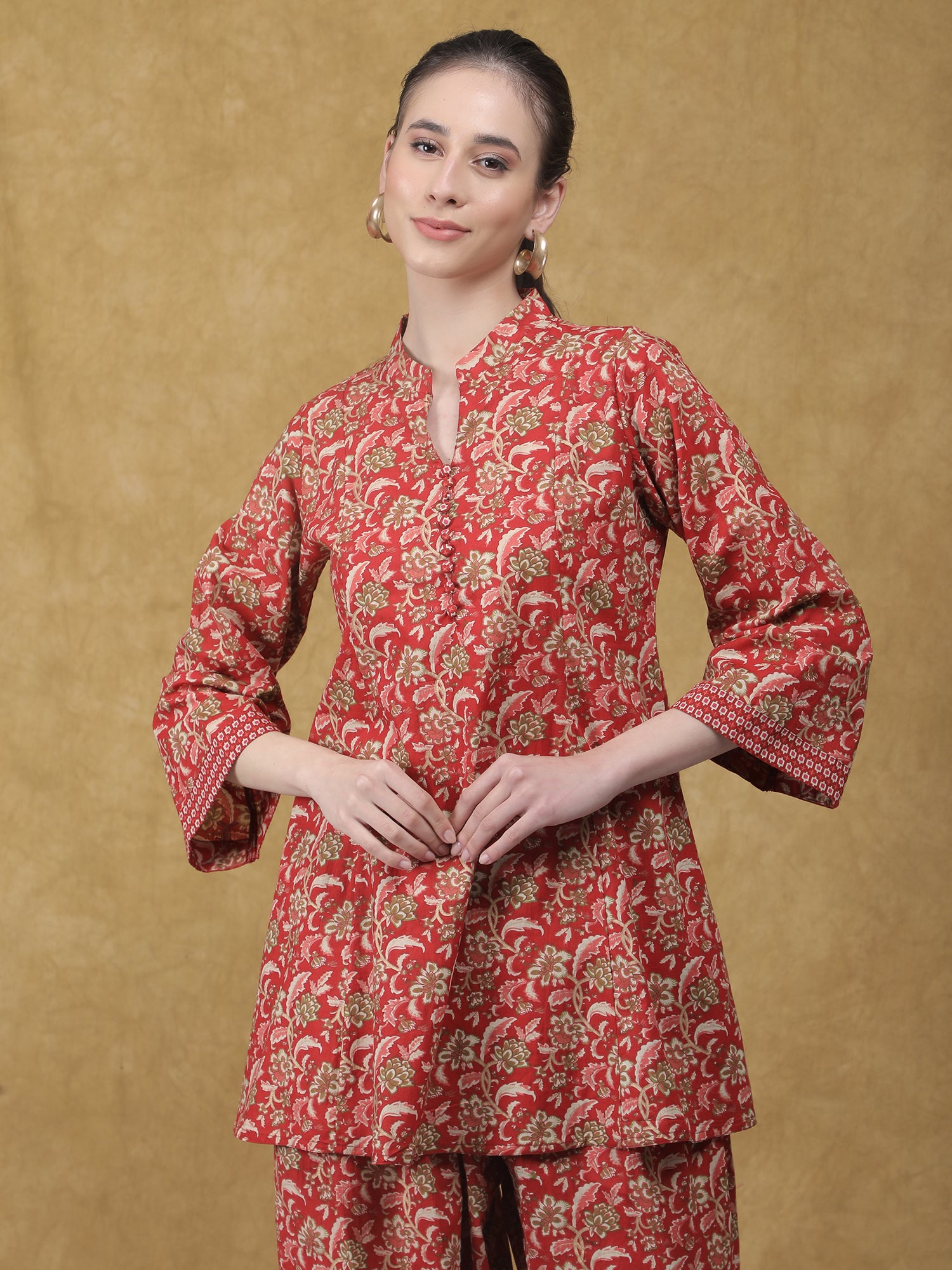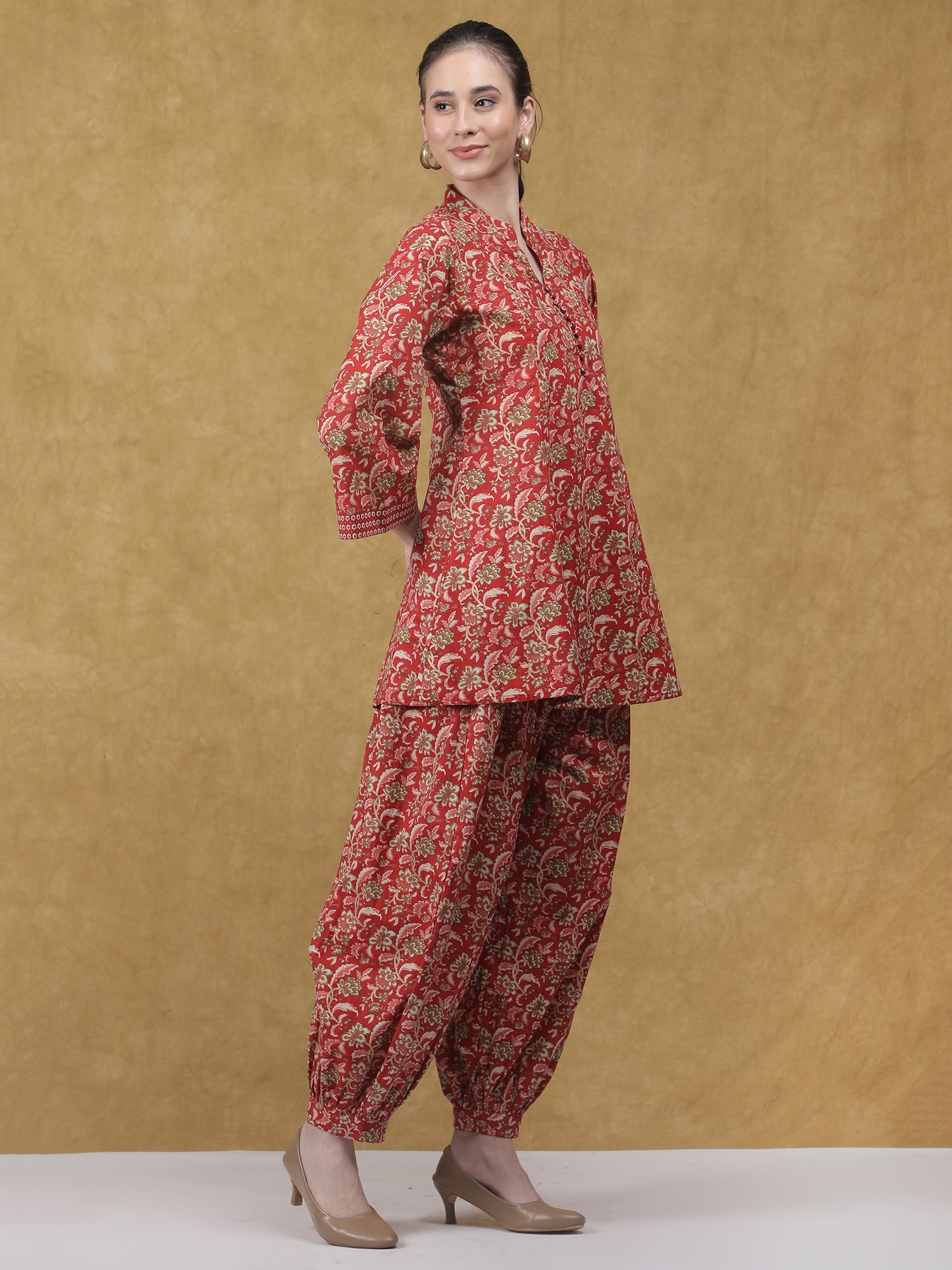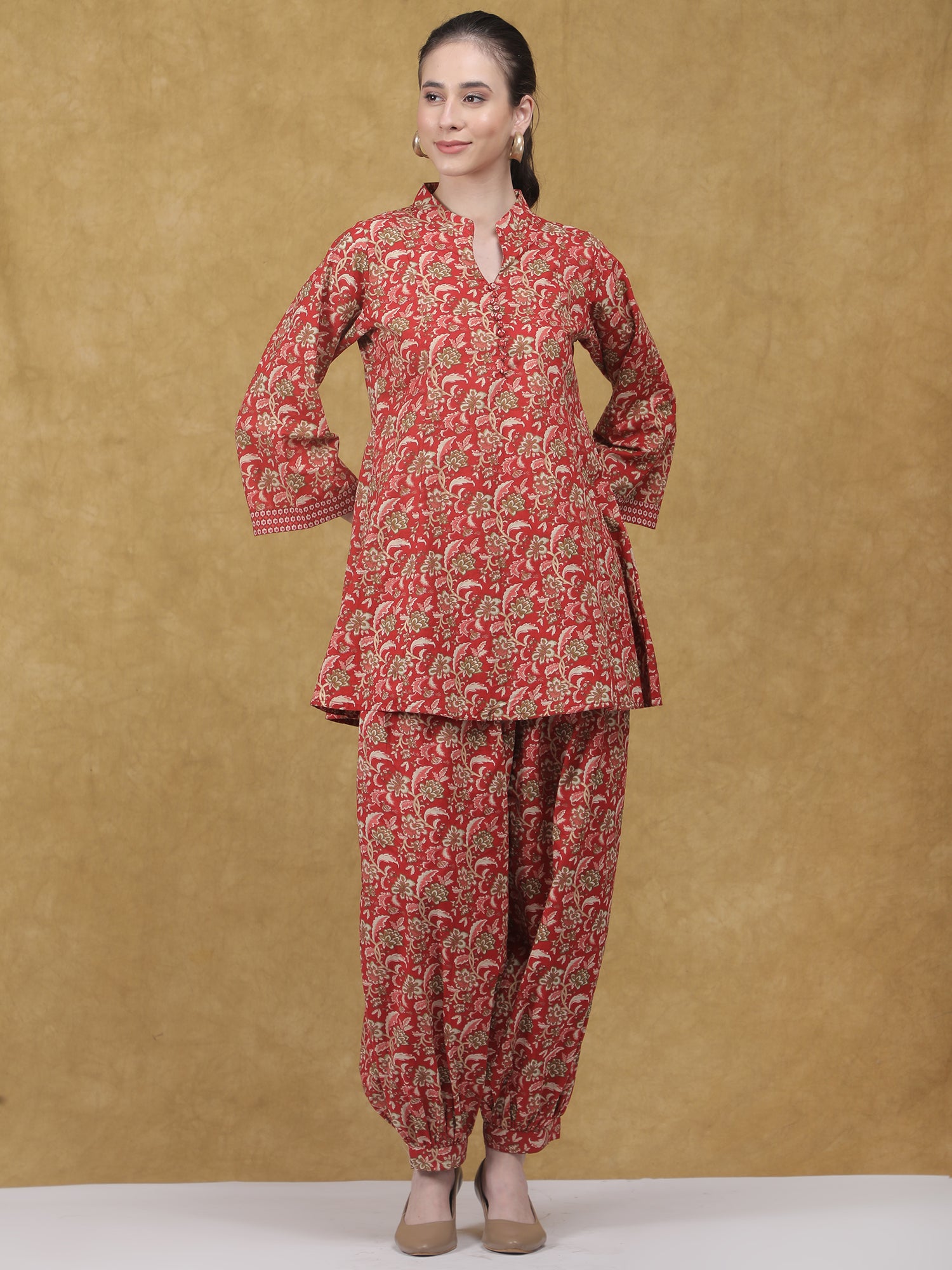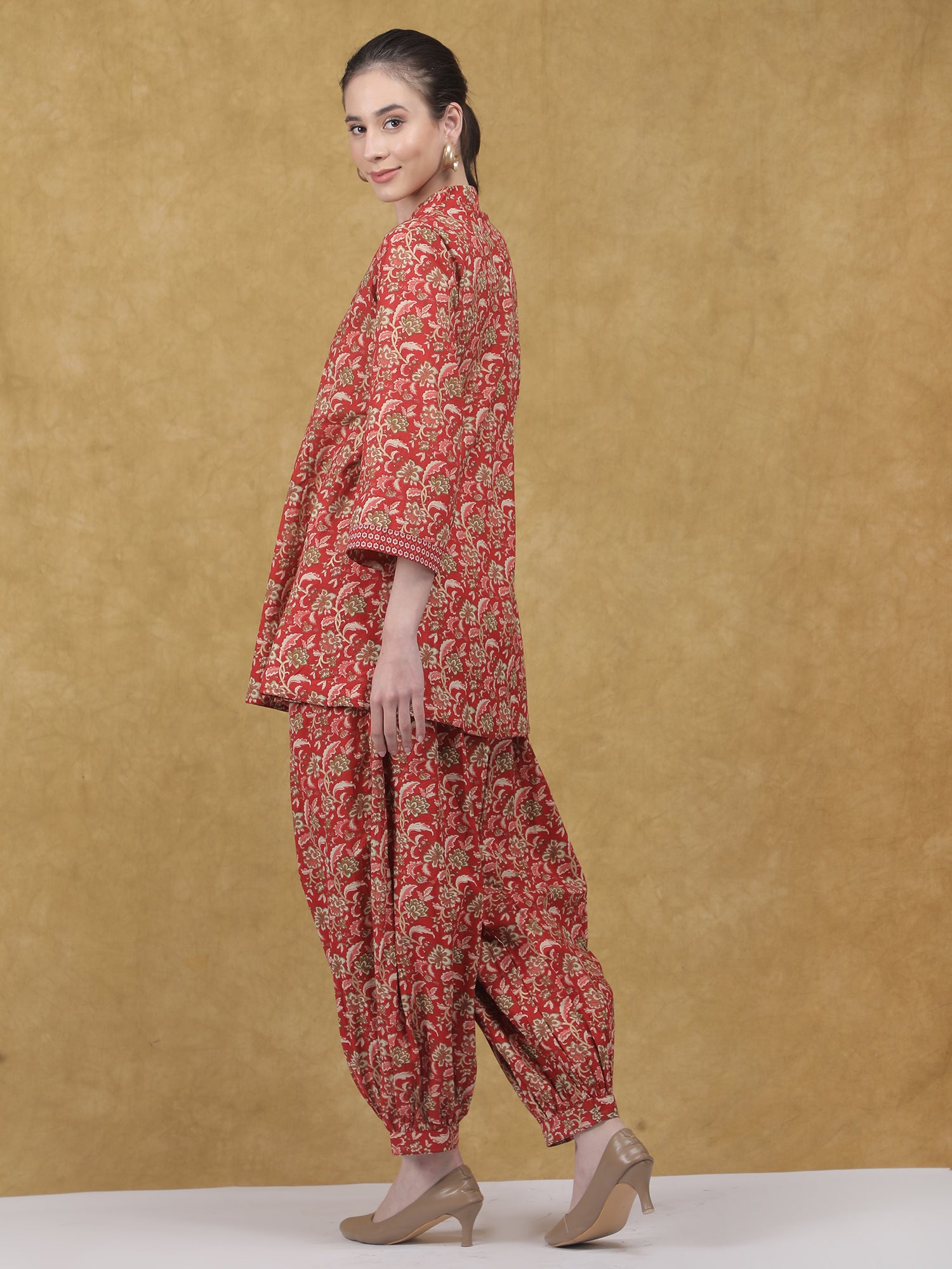 Elegant and rooted in tradition, the Mehfil Co-ord Set brings together classic prints and a relaxed silhouette for timeless everyday wear. Crafted in soft, breathable cotton, the set features a kurta-style top in a rich red hue, highlighted with intricate all-over floral motifs. The straight-cut kurta is designed with a mandarin collar and buttoned placket, complemented by three-quarter sleeves detailed with subtle contrast borders. Paired with coordinated printed pants featuring a softly gathered hem, the look feels cohesive, comfortable, and effortlessly refined. Ideal for daytime festivities, cultural gatherings, or elevated casual wear.