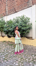 The wide-flared sharara stands out with intricate hand-painted patterns and a striking pink border that lends a refreshing pop of colour. Scattered gota accents along the panels enhance the festive appeal, creating a captivating flow with every step.