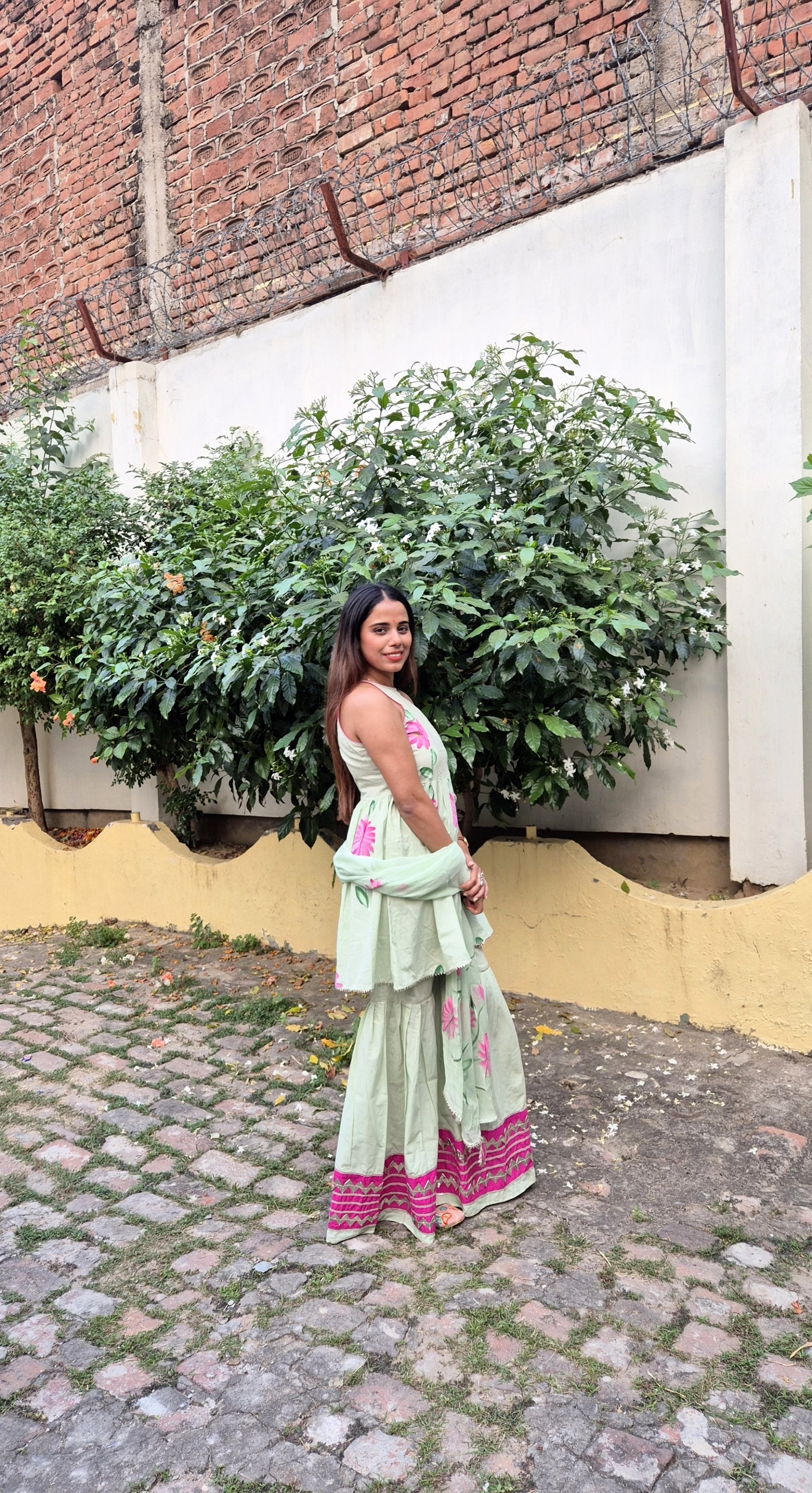 The sleeveless kurta in a soothing pista green tone is adorned with graceful hand-painted floral motifs, exuding timeless beauty. A hint of gota detailing along the neckline adds a gentle shimmer, perfectly balancing tradition with modern finesse.