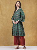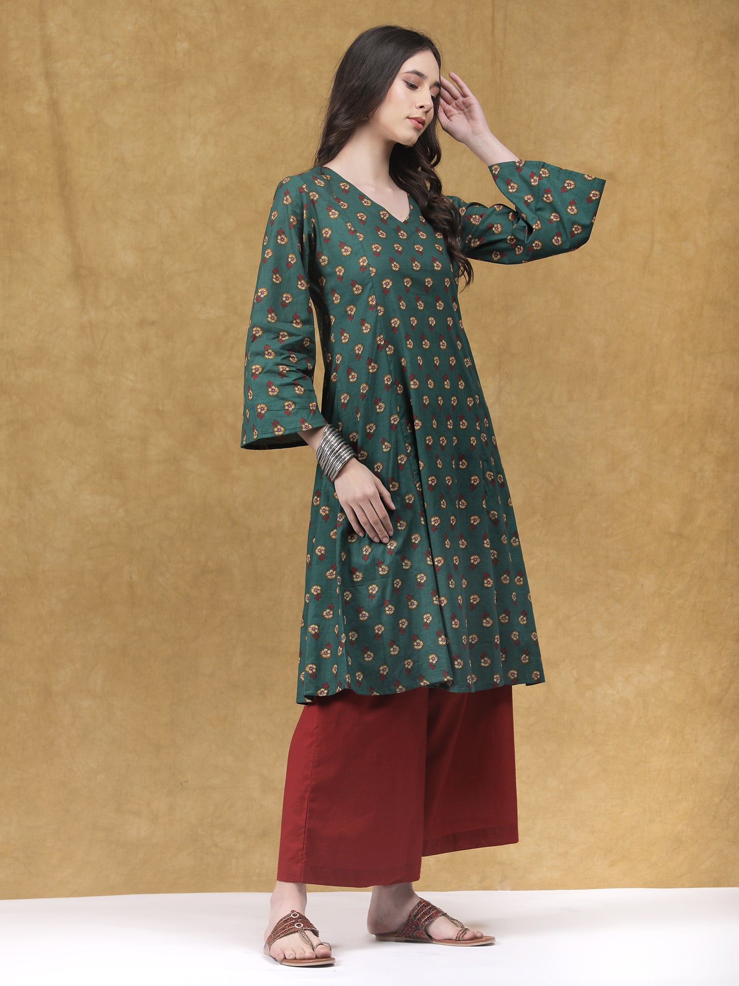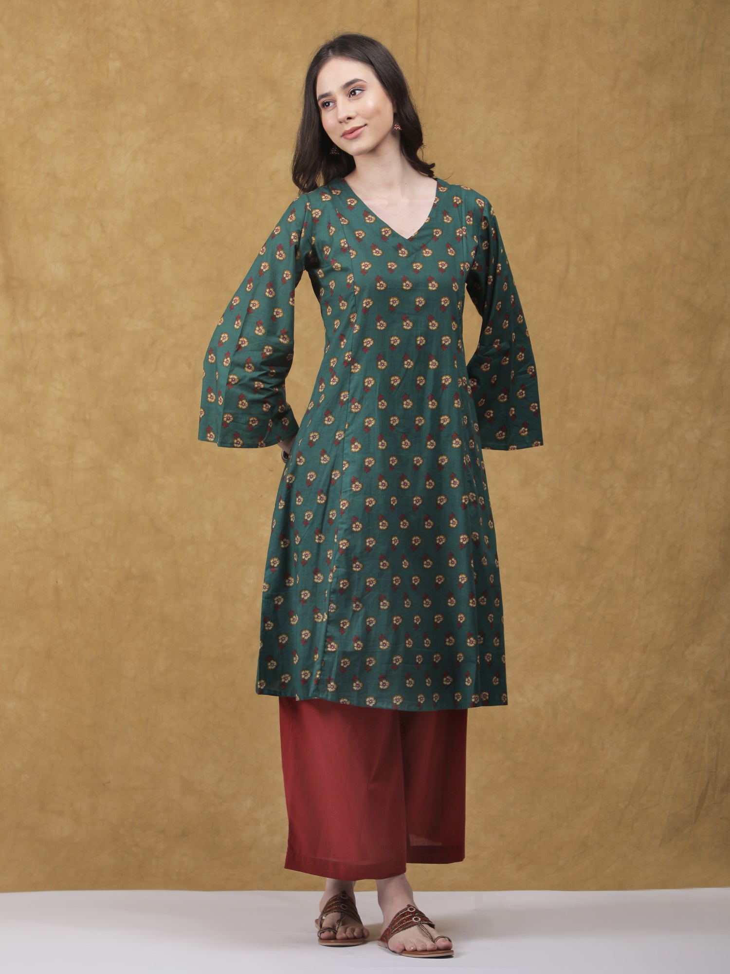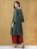 Graceful and effortlessly versatile, the Vanika Co-ord Set is designed for comfort-led elegance with a touch of tradition. Crafted in breathable cotton, the set features a deep green kurta-style top adorned with delicate all-over ethnic motifs that add visual richness without overpowering the look. The kurta is styled with a soft V-neckline and relaxed three-quarter sleeves, creating an easy, flattering silhouette. Paired with solid red straight-fit pants, the contrast adds warmth and balance, making the ensemble perfect for everyday wear, workdays, or casual festive moments.